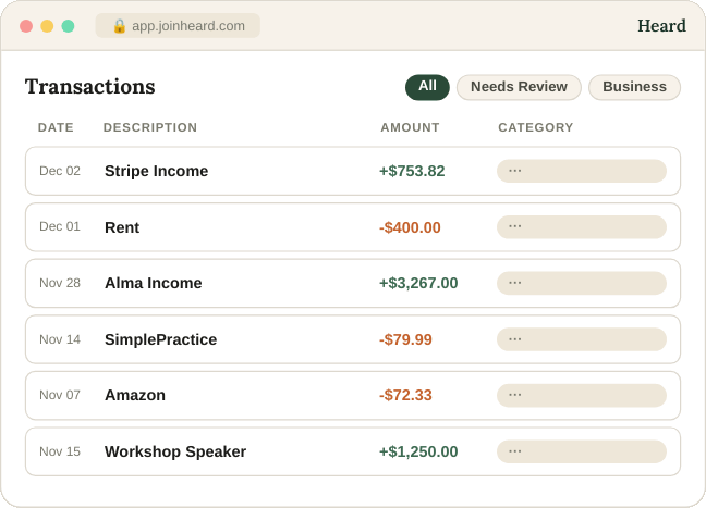 You shouldn’t have to navigate your finances alone. Heard gives you direct access to tax and accounting experts who understand the realities of running a private practice or being self-employed.